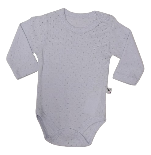 З довгим рукавом. Кнопки зверху на плічках і між ножками.